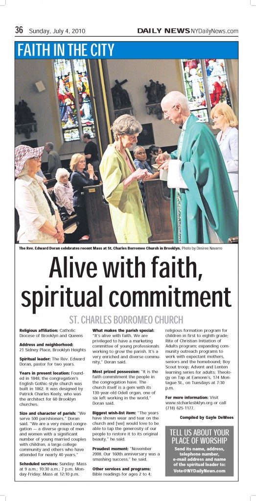 Bulletin2 NY Daily News Feature September 12, 2010October 17, 2010 | St. Charles Borromeo St. Charles was featured in the Faith in the City column in the New York Daily News in July. You can view it here. (Reproduced with permission of the New York Daily News).