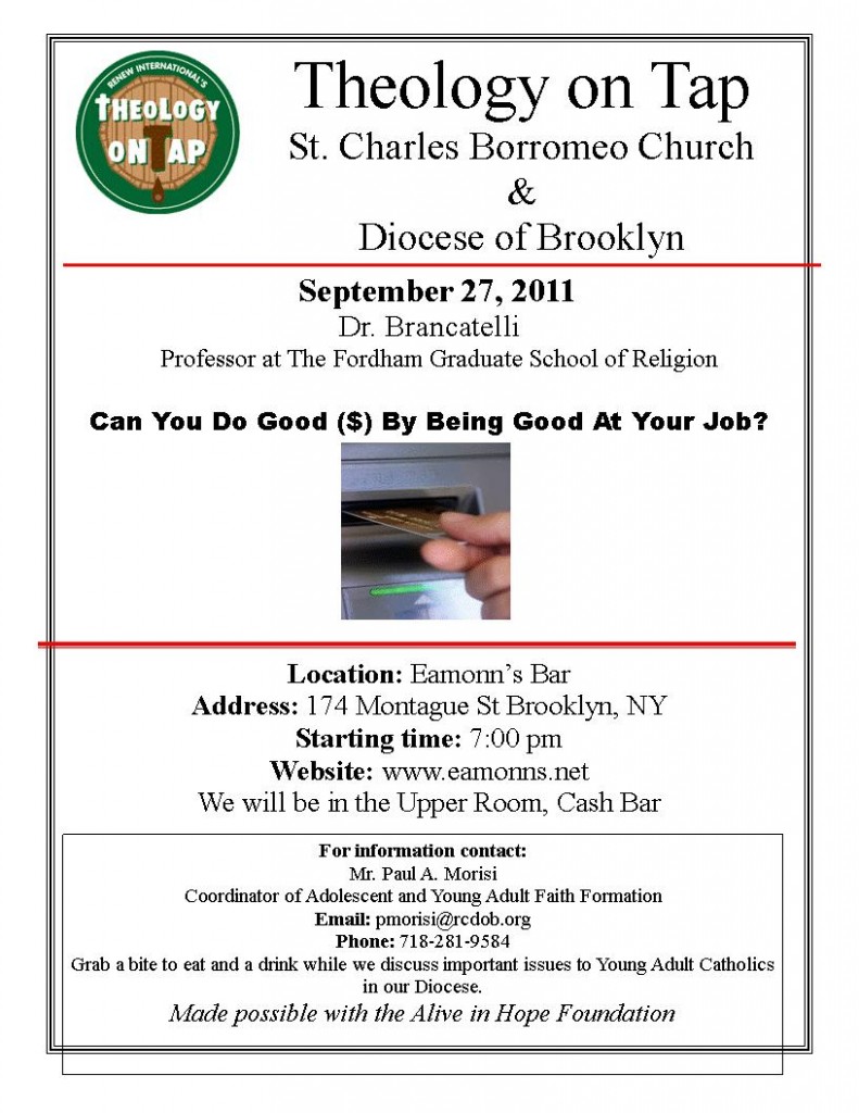 Once again SCB will be sponsoring Theology On Tap at Eammon’s Restaurant located at 174 Montague St.