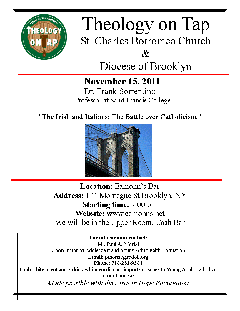 Events Theology on Tap Tue. Nov. 15 November 7, 2011 | St. Charles Borromeo Join us for Theology on Tap with Dr. Frank Sorrentino on Tuesday, November 15 at Eamonn’s on Montague Street.