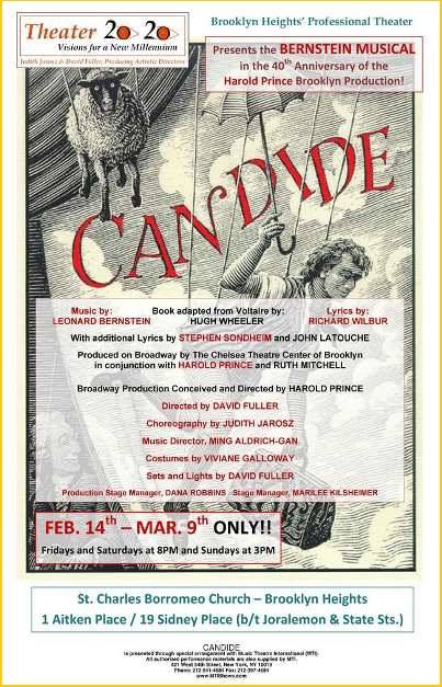 Join us for Theater 2020’s production of the Leonard Bernstein musical Candide from February 14 – March 9. Performances are on Friday and Saturday at 8 PM and Sunday at 3 PM. Tickets are $18 and available online at http://www.brownpapertickets.com/event/543936.