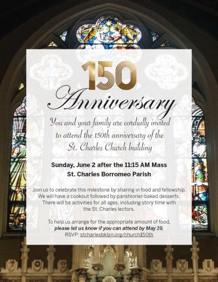 Join us to celebrate this milestone by sharing in food and fellowship. We will have a cookout followed by parishioner-baked desserts. There will be activities for all ages, including story time with the St. Charles lectors.
