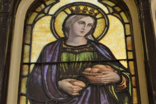 St. Elizabeth of Hungary from our sanctuary stained glass. A princess, she gave up her position of royalty and wealth to serve the poor, endearing her as the patron saint of charities. Her feast day is November 17.