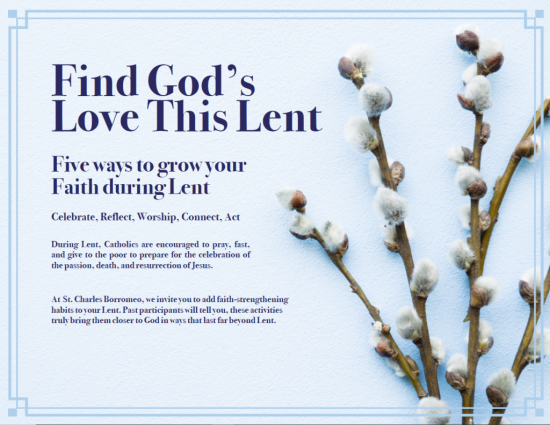 You are invited to join our Live Lent Faith Sharing Groups starting Sunday, March 1. Groups meet Sundays at 8 AM or 6 PM in the Parish House/Rectory. No need to attend every session.