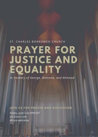 Please join for evening prayer on June 5 at 5 p.m. This week, we will pray together for the victims of racial injustice and for reform in our nation. The prayers will be followed by a brief novena to St. Anthony and then by a discussion with Tevin Williams and Josephine Dongbang about racial injustice and what we can do for progress.