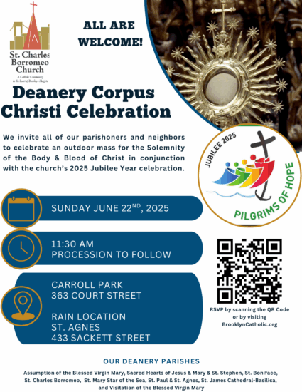 The Mass will start at 11:30 AM in Carroll Park in Carroll Gardens. There will be no morning Masses at St. Charles Borromeo this Sunday. We will still have a 7 PM Mass