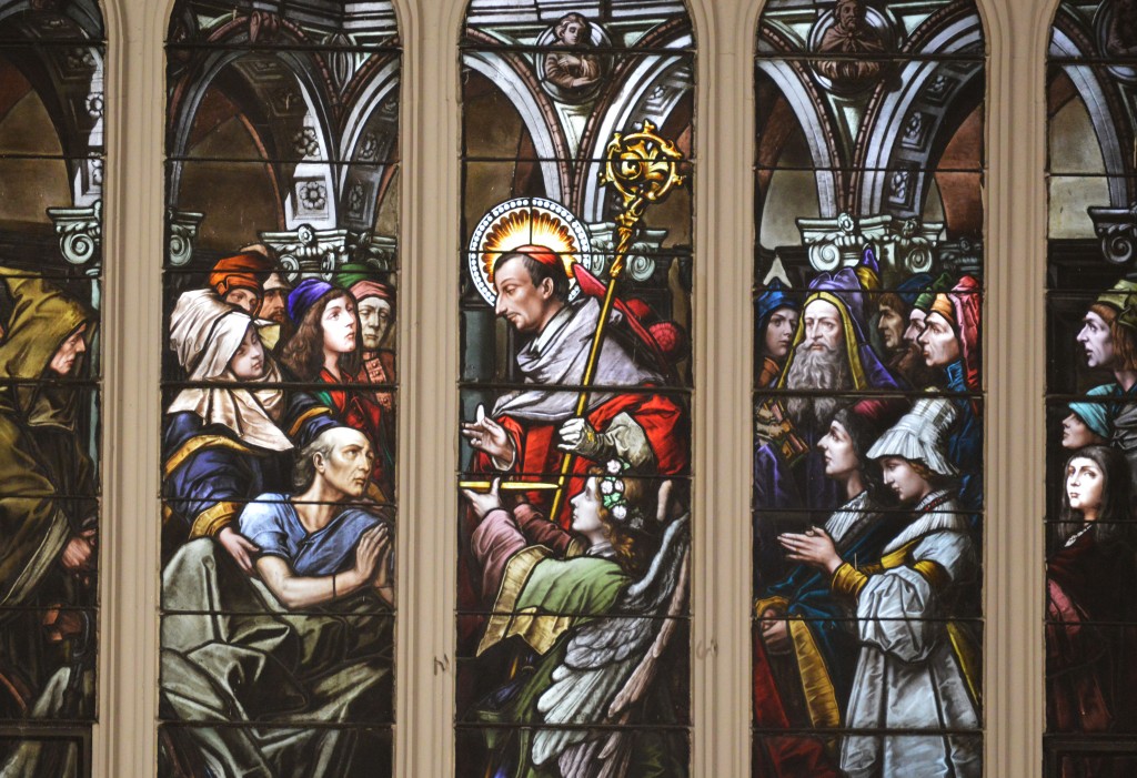 Our central stained glass window depicts St. Charles tending to the people of Milan when a plague struck in 1576. He decided to stay to help when the civil authorities and nobles abandoned the city.